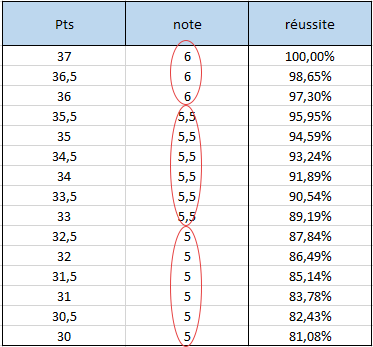 Il n’y a que trois résultats qui donnent la note 6 contre six qui donnent les notes 5,5 et 5 (pareil pour le 4,5 et le 4).